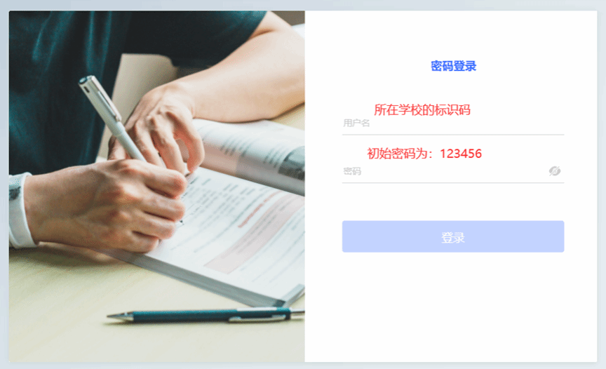 4.登陆。账号:学校的标识码(可问本单位人事处或者网上查询,一般为10位数字),密码为:123456.(如果密码已经更改或者无法登陆,如提示密码有误,可拨打4008757650进行密码重置)。
