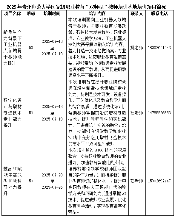 为深入贯彻全国教育大会精神,落实《教育强国建设规划纲要(2024-2035年)》要求,助力构建完善的教师专业发展支持服务体系,加强新时代高水平职业教育教师队伍建设,依据教育部教师工作司《关于组织参加国家级职业教育培训基地2025年培训项目的通知》(教育部司局函件),人生就是博ag(中国区)·公司官网将于2025年7月在贵州省贵阳市组织开展职业教育“双师型”教师培训共3期。现将各培训项目信息予以发布。