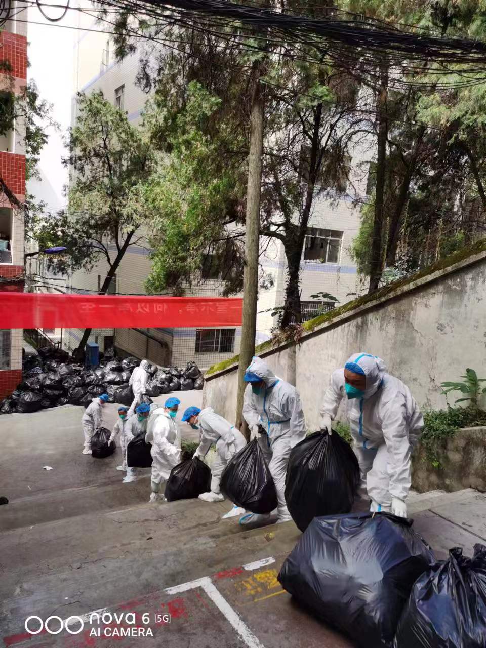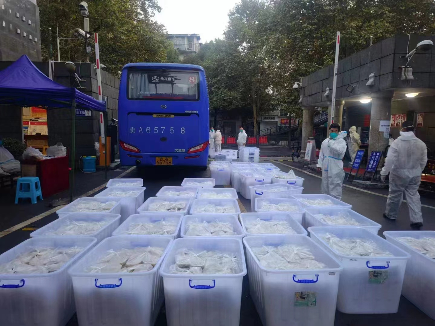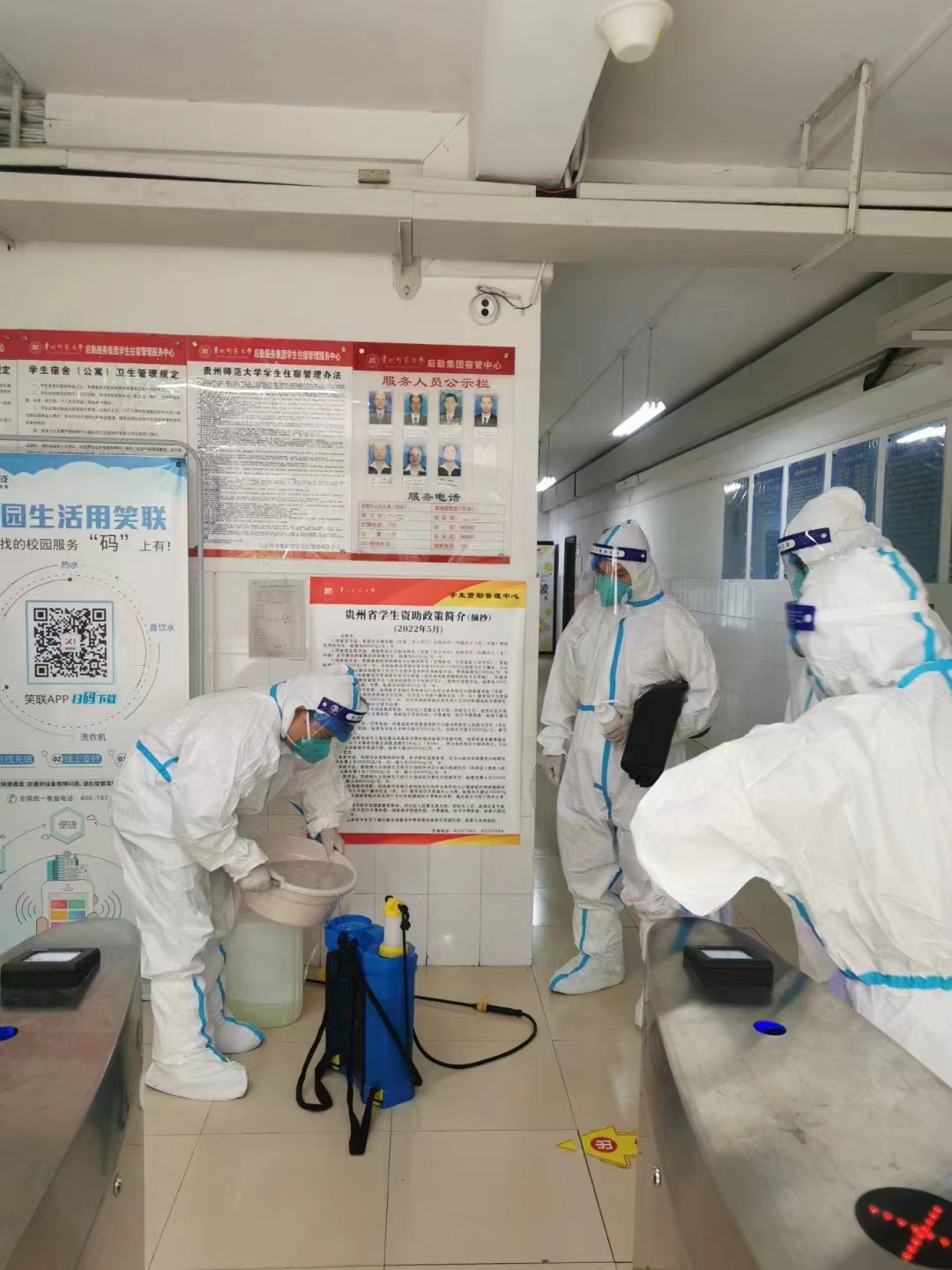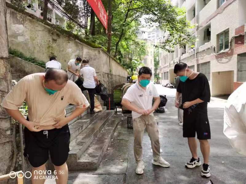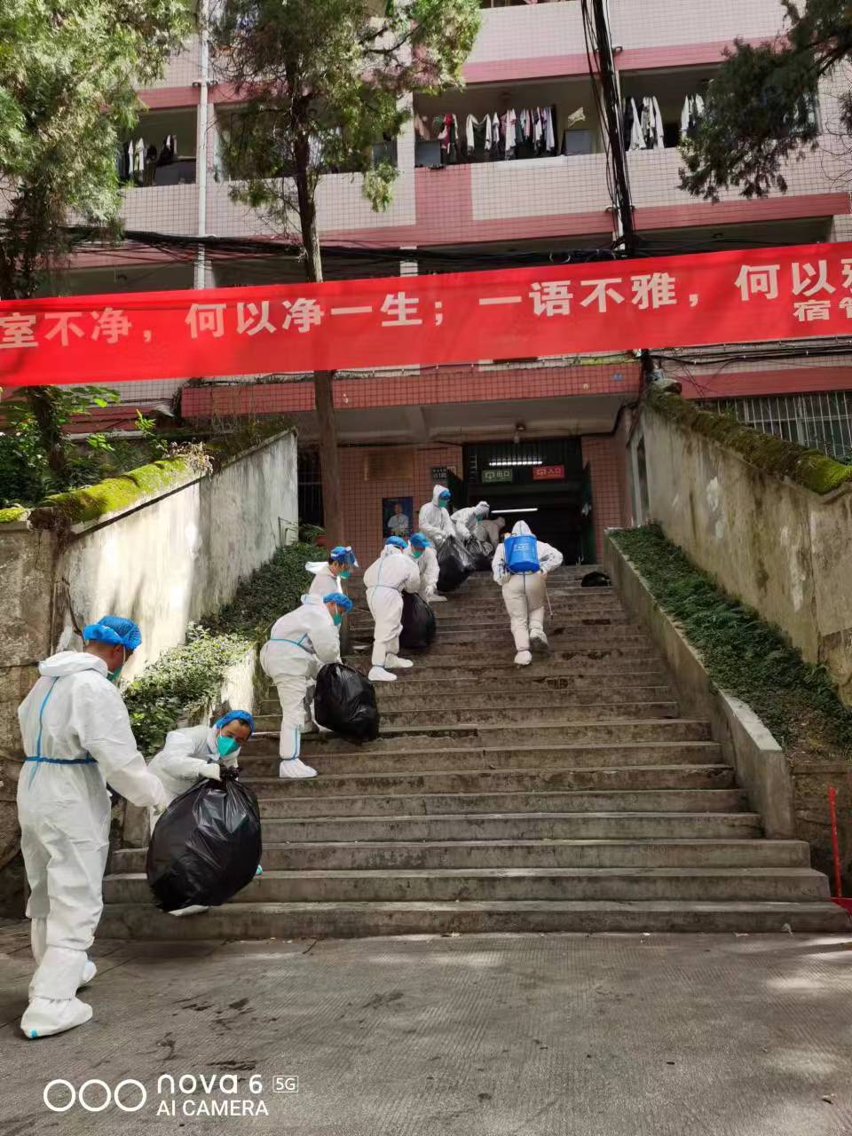 因宝山校区突发疫情,校园内封闭管理,员工足不出寝,李芳、徐锐一下车就立刻分工到岗,穿戴防护服,进入员工寝室分发抗原,一一核对员工姓名,确保不漏一人。花溪校区食堂承担起两个校区的供餐保障,因宝山校区后勤、保卫岗位人手紧缺,李芳、徐锐一方面深入员工寝室做好员工思想工作和抗原检测工作,另一方面与其他工作人员一起为员工送餐、清运寝室内垃圾、在校园内各卡点值班值守。金秋九月的贵阳天气依然炎热,他们穿上防护服一工作就是四五个小时,尤其是接力清运寝室内生活垃圾后,脱下防护服,里面的贴身衣物都能拧出大把的汗水。即便如此,没有一个人退缩,没有一声抱怨,坚决执行疫情防控工作任务。