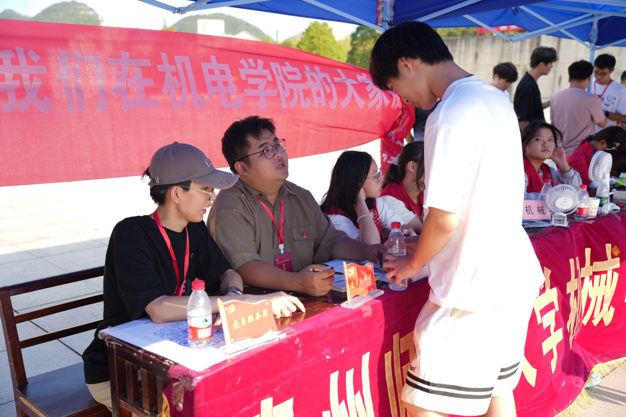 8月30日,新生入学报到当天,校园内处处洋溢着热烈而温馨的氛围。胸前佩戴着闪耀的党徽和印有“党员先锋岗”胸牌的员工党员们,用热情的笑容、亲切的关怀从新生家长手中接过大包小包的行李,引导他们到学院报到点办理手续。他们以实际行动践行党的初心和使命,用热情为新生提供咨询引导、行李寄存、报到注册等一站式服务,确保新生顺利入学。