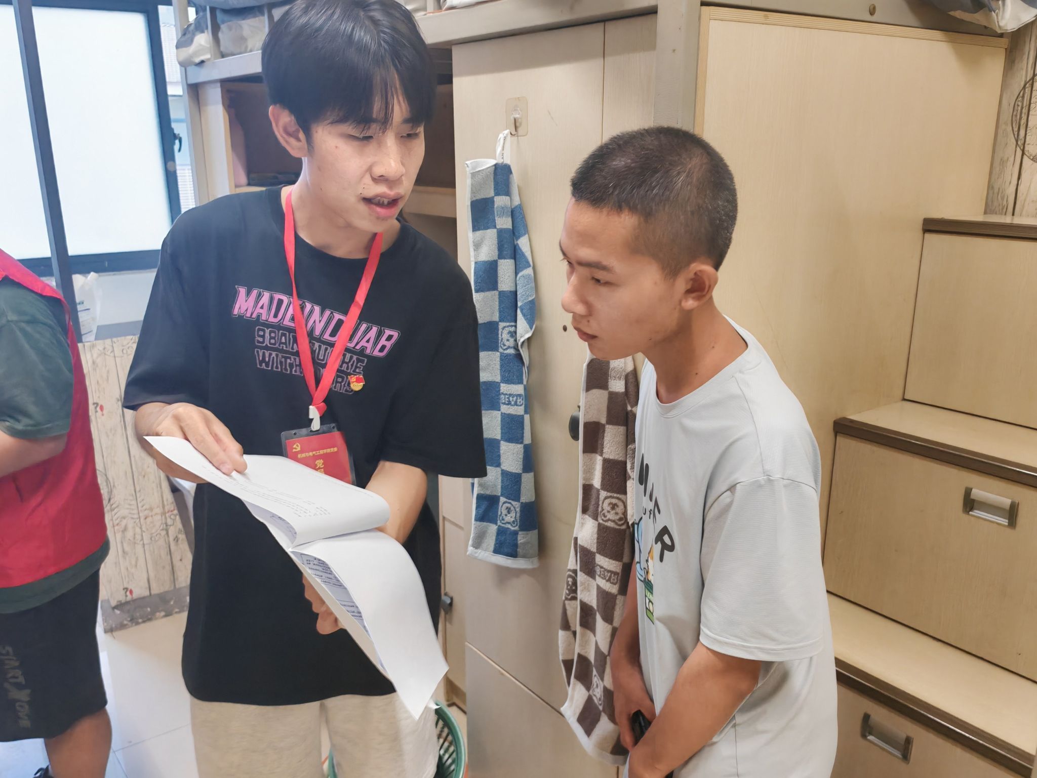 走寝过程中,“党员先锋岗”的同学还结合自身的成长经历,为新生的大学规划提供了诚恳的建议,分享了生活和学习经验,帮助新生了解学校图书资源,引导新生掌握有效的学习方法,养成良好的学习习惯。此外,还专门强调提高安全防范意识,特别是防范网络诈骗的重要性,提醒他们提高警惕,守护好人身和财产安全。