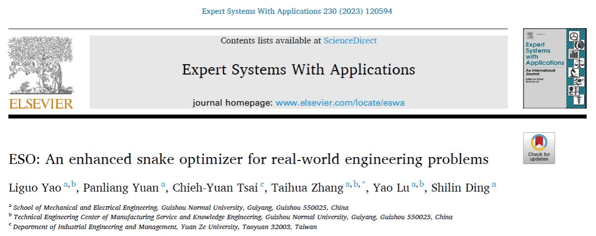 近日,公司人生就是博ag(中国区)·公司官网制造服务与知识工程团队(张太华教授团队)在计算机科学领域1区TOP期刊 Expert Systems with Applications(IF=8.5)发表题为“ESO: An enhanced snake optimizer for real-world engineering problems”的研究论文。