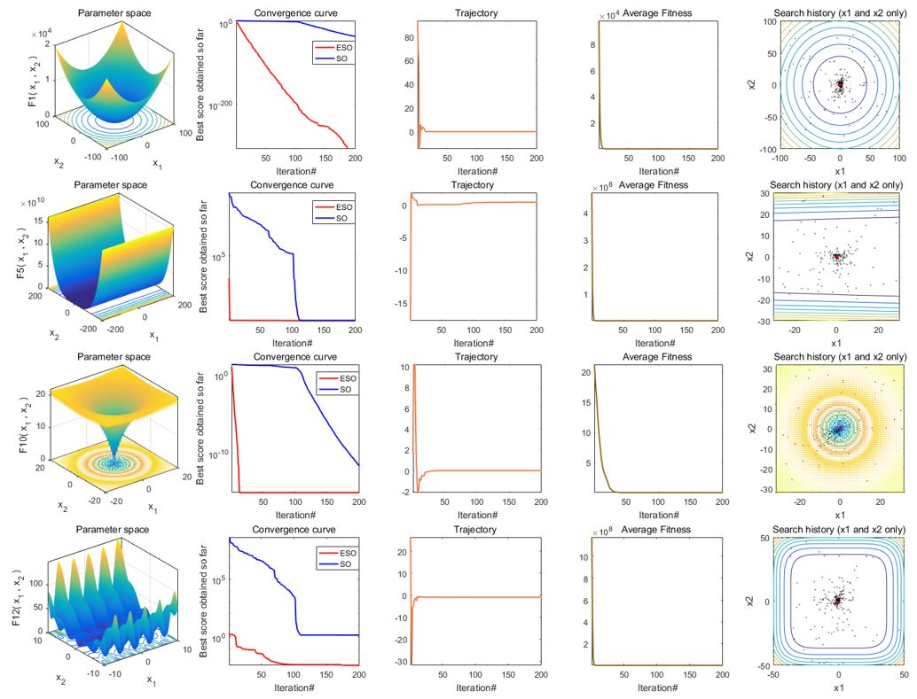 在部分函数上的收敛曲线、轨迹、平均适应度和搜索历史