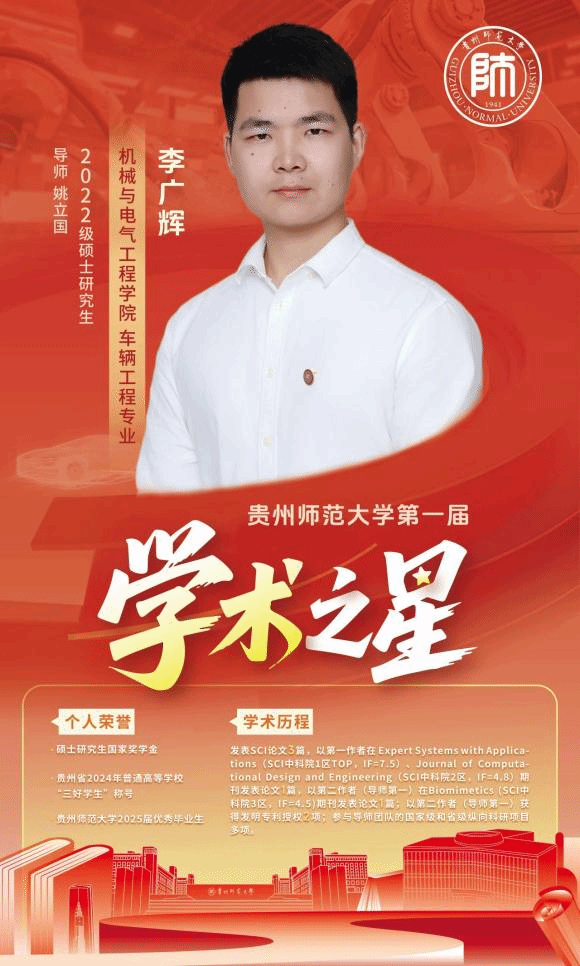 李广辉同学师从姚立国副教授,在学术道路上奋力深耕。他发表SCI论文3篇,以第一作者身份在Expert Systems with Applications(SCI中科院1区TOP,IF=7.5)、Journal of Computational Design and Engineering(SCI中科院2区,IF=4.8)期刊发表论文各1篇,以第二作者(导师第一)在Biomimetics(SCI中科院3区,IF=4.5)期刊发表论文1篇;以第二作者(导师第一)获得发明专利授权2项;参与导师团队的国家级和省级纵向项目多项。