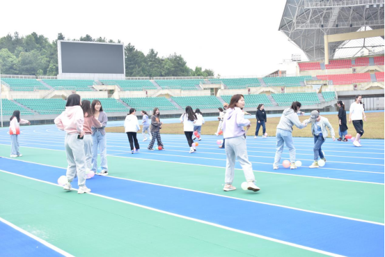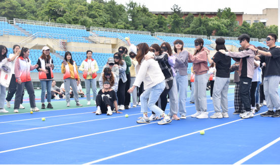 分别由16人组成的六条贪吃蛇准备出发啦!在寻找小球的过程中不可以说话,只可以靠大家的肢体语言来判断小球在哪里,有效地考验了同学们之间的团队合作精神和默契程度。