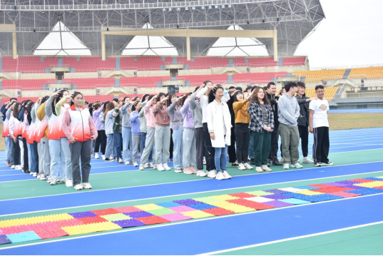 用特别的方式大声喊出我们的口号——“威武机电,身强心健”,用时最少的队伍获胜。